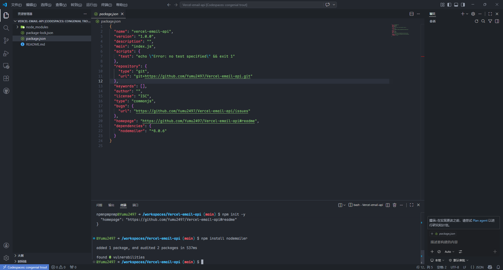 codespaces已经默认安装了nodejs,我们可以直接开始编写代码。 初始化项目,在终端内输入