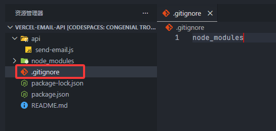 return res.status(200).json({ success: true, messageId: info.messageId }); } catch (error) { return res.status(500).json({ success: false, error: error.message }); }}处理 .gitignore, 这个文件顾名思义就是忽略文件,被写在里面的文件或目录会被git排除,不会被上传到仓库。