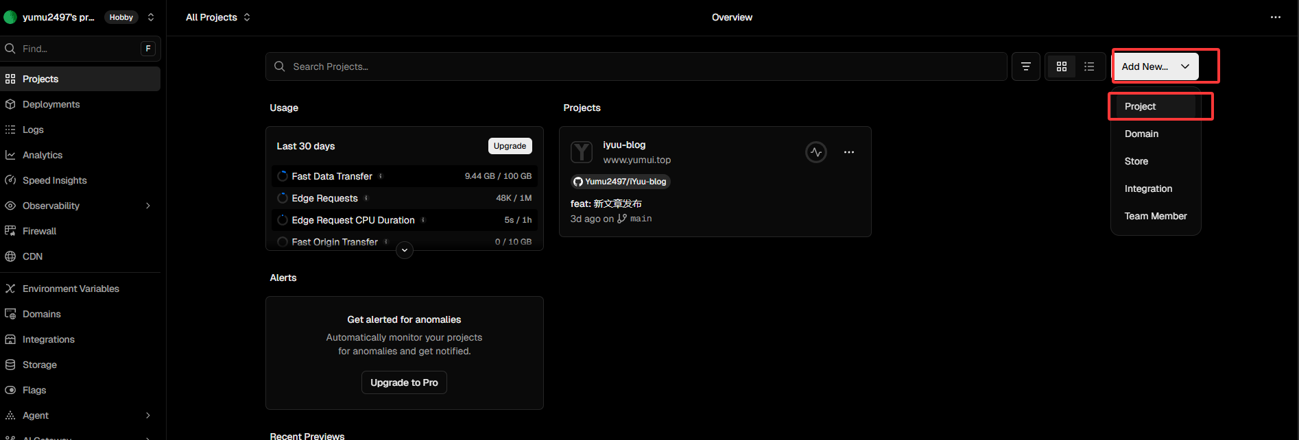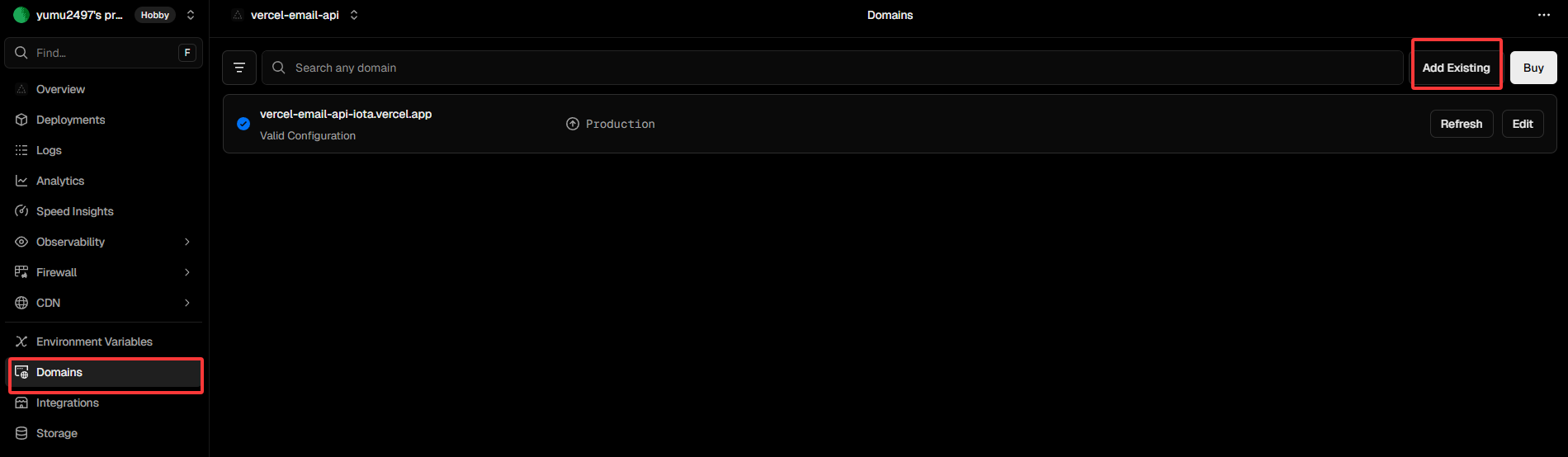 若你拥有一个域名,可以使用自己的域名,Vercel支持自定义域名。