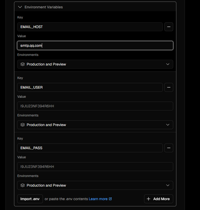 填写环境变量,上面的配置默认即可,若是qq邮箱则EMAIL_HOST=smtp.qq.com