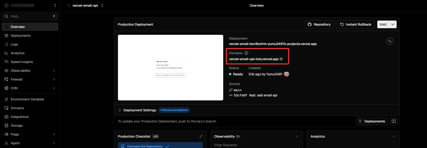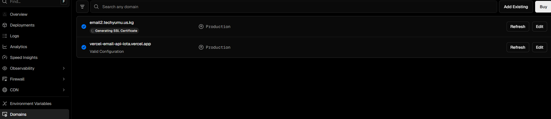 等待一会让DNS解析成功,当你在Vercel看到域名为蓝色勾勾时就成功了,这时候你就可以用自己的域名来调用接口。