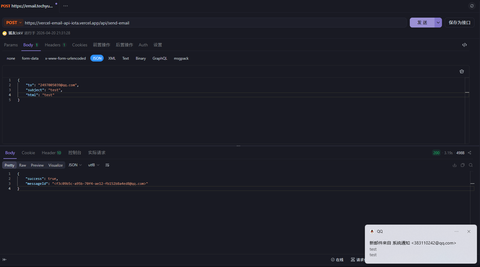 注意接口地址是https://vercel-email-api-iota.vercel.app/api/send-email