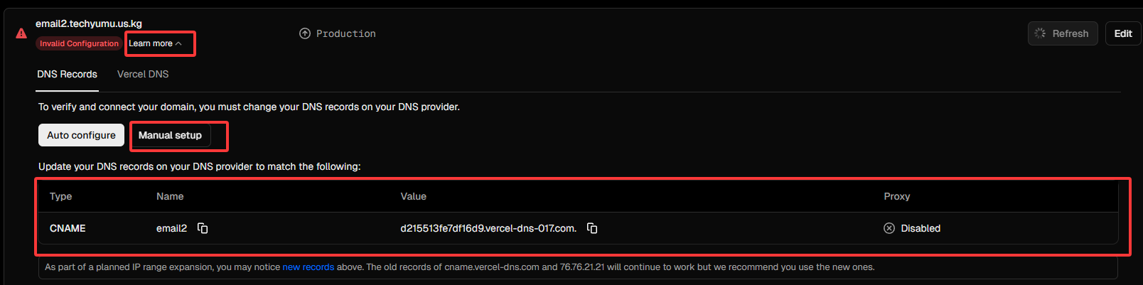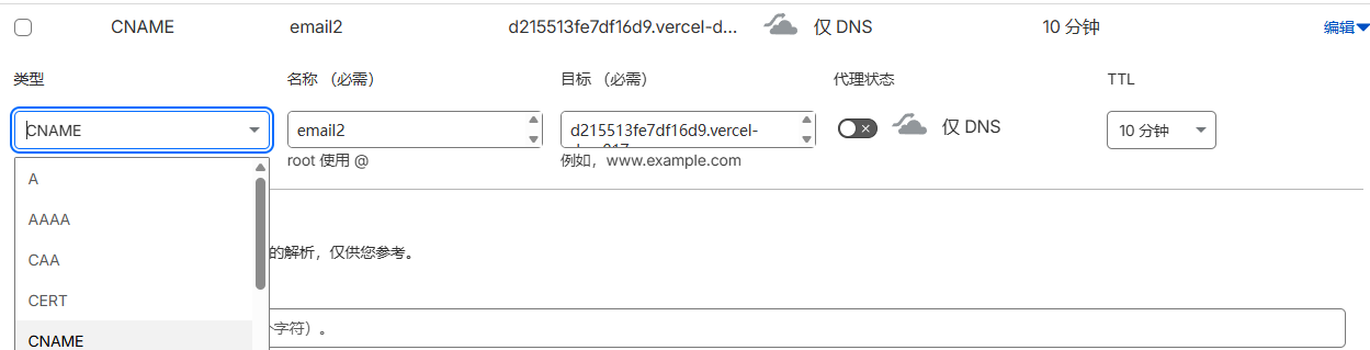 按照上方信息填写,类型是CNAME,名称是email2,目标是Vercel里提供的value。代理状态选择小灰云,点击下方保存。