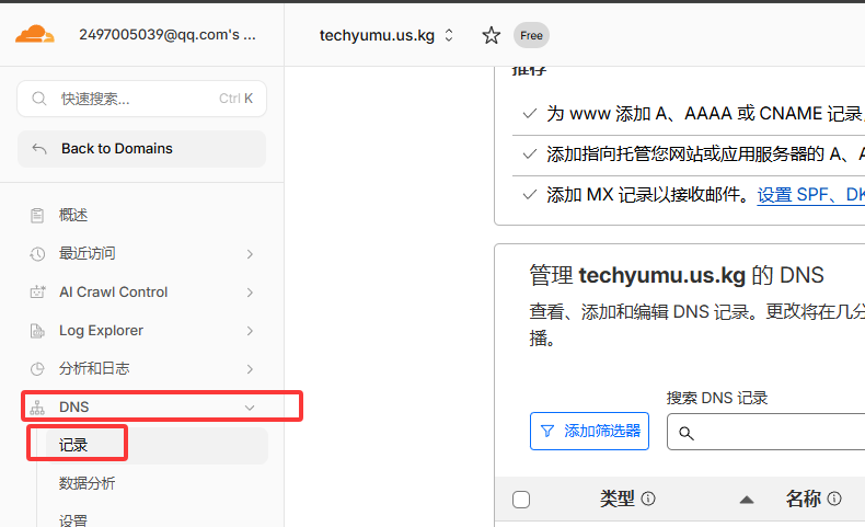 到Cloudflare里找到DNS-记录